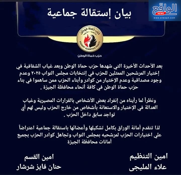 ووقع على البيان كل من علاء المليجي، أمين التنظيم، وحنان فايز شرشار، أمين القسم، مؤكدين أن قرار الاستقالة جاء اعتراضًا على “تجاهل القواعد التنظيمية الحقيقية داخل أمانات الجيزة”.